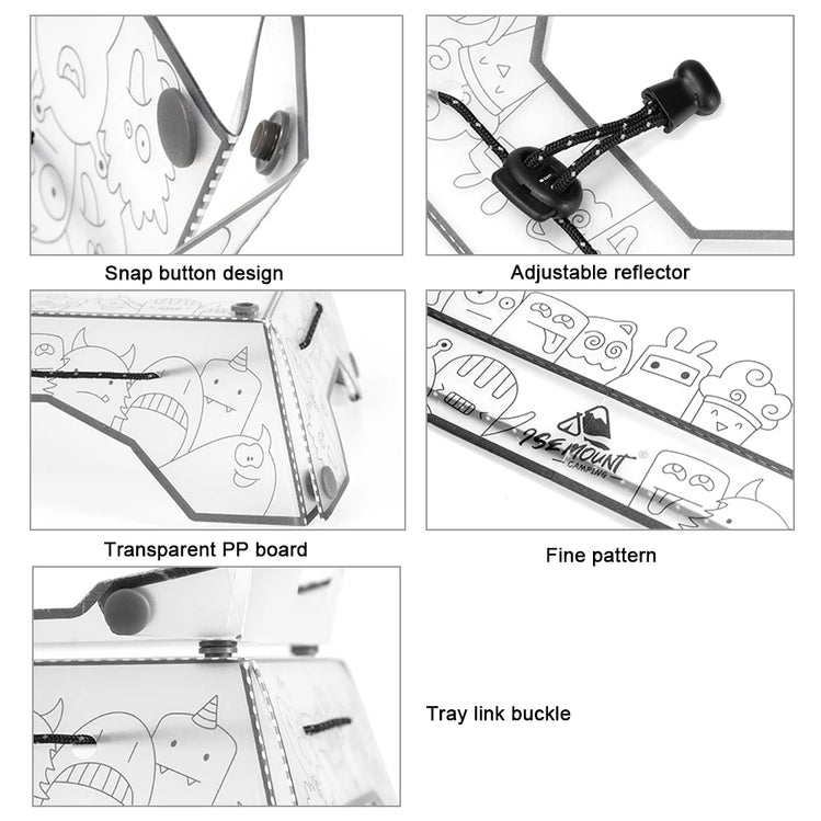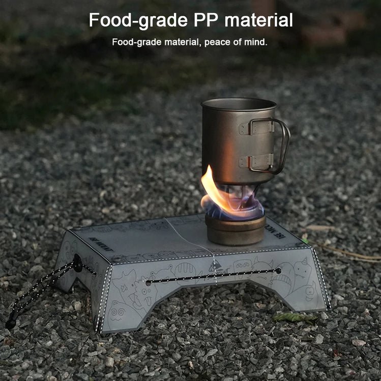Features: 1.Snap-on Design for Enhanced Stability: The folding camping table features a thickened desktop with a snap-on design, providing superior load-bearing capacity for added stability. 2.Safe and Reliable Material: Made from food-grade PP material, this foldable camping tray offers peace of mind with its safe, non-toxic, and sturdy construction. 3.Ultra-Lightweight and Portable: As thin as a cicada's wing and light as a feather, this small backpacking table is designed for easy folding and packing, making it for outdoor, climbing, or travel use without adding any burden. 4.Easy and Quick Installation: Transform from flat to 3D in a snap by simply pulling tight the adjusting rope of this outdoor fishing furniture. 5.Effortless Cleaning: Maintain your mini dining table spotlessly clean with just one wipe, leaving no residue or odors. It's resistant to stains and is easily cleaned with a wet wipe. Specification: Origin: Mainland China Material: PP