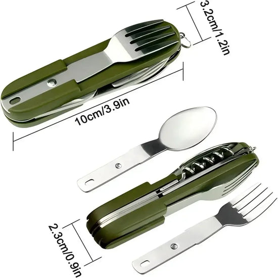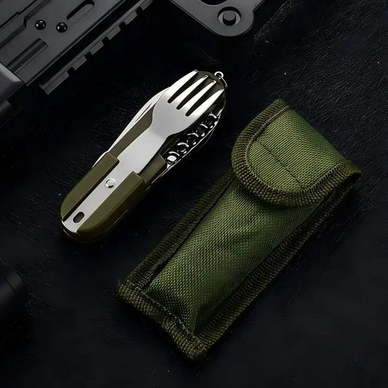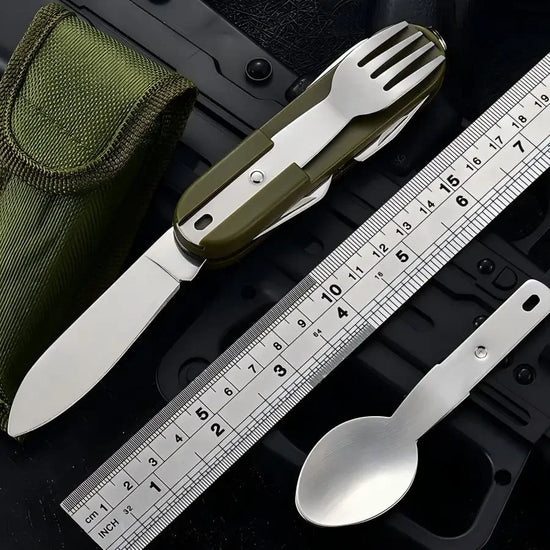 has 7 functions, such as fork, spoon, knife, bottle opener, can opener.