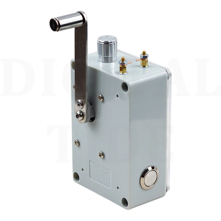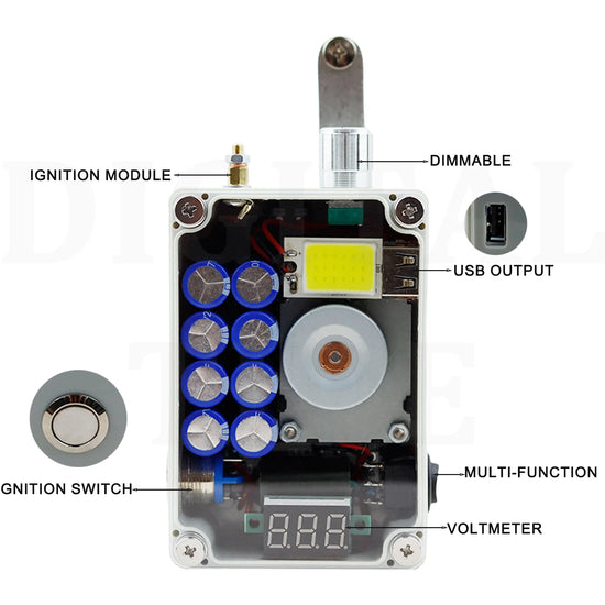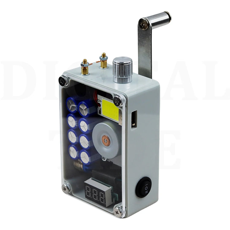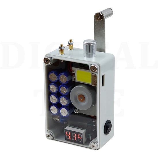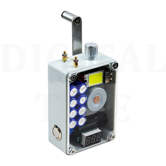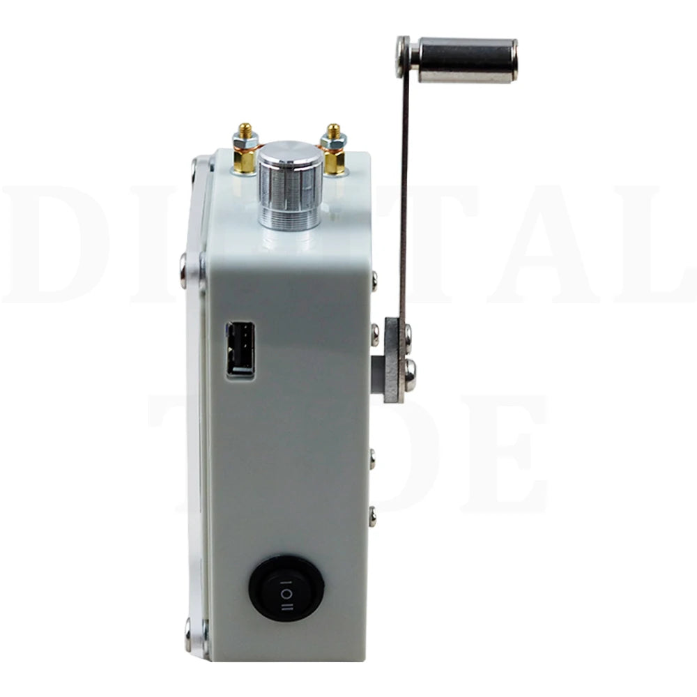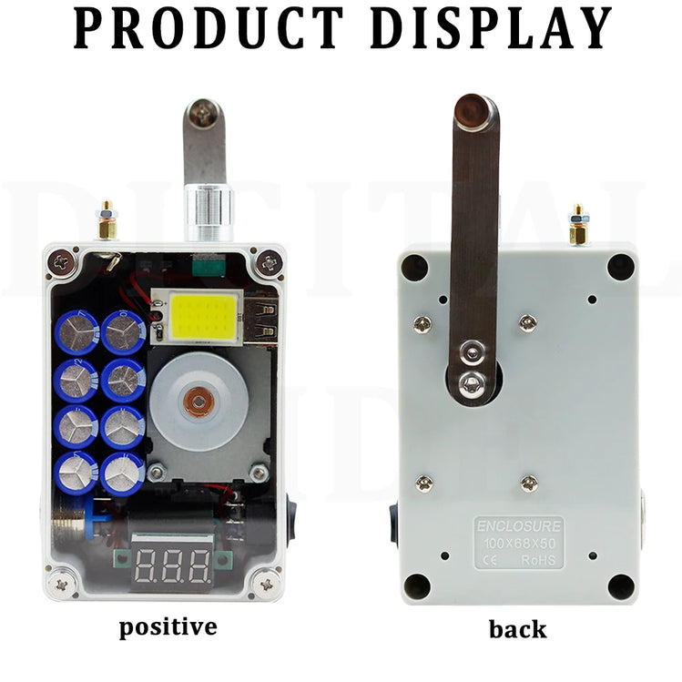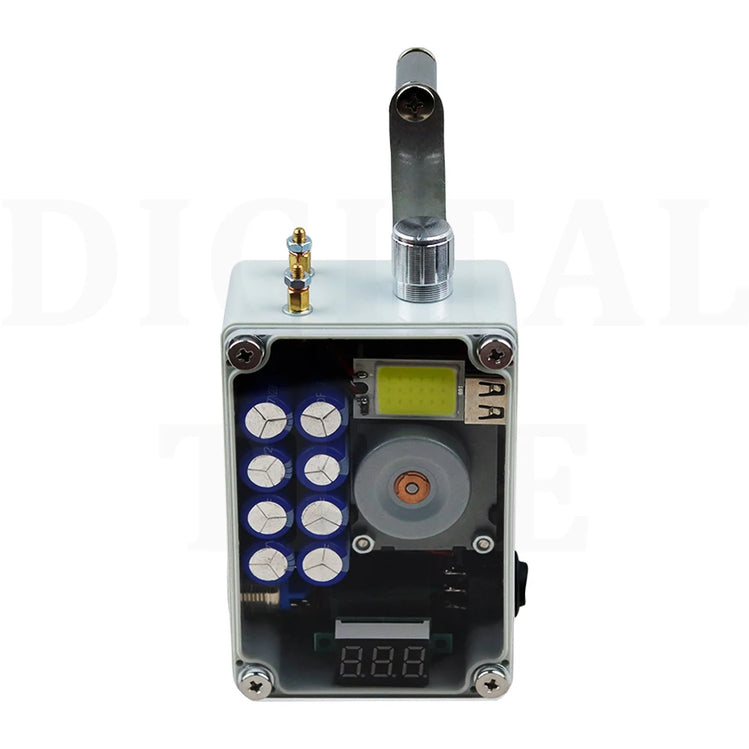 Hand cranked generator, portable lighting, ignition, USB charging. Super large COB light panel, stepless dimming, aluminum alloy dimming knob, with brightness memory function, automatically saving the last brightness when turning off the light, manual cranking for 2 minutes, high light endurance for 20-30 minutes, low light endurance for more than 8 hours. ABS shell acrylic panel, CNC computer hole processing, beautiful and practical. The red LCD voltmeter provides a very intuitive display of real-time voltage, remaining power, and full charge of 9-10V. Ultra high power ignition module, pure copper ignition electrode column (temperature is very high, do not touch the electrode column during ignition), built-in high-quality super capacitor, USB output power 5V1A, hand cranking generates 0.56A per second for two turns, and 0.8A per second for three turns. Mobile phone charging should be maintained at least two turns per second, and hand phone charging is suitable for emergency use. Size: 9.8cm * 6.6cm * 3.8cm. Weight: 280 grams. Speed: Hand cranking 2-3 revolutions per second